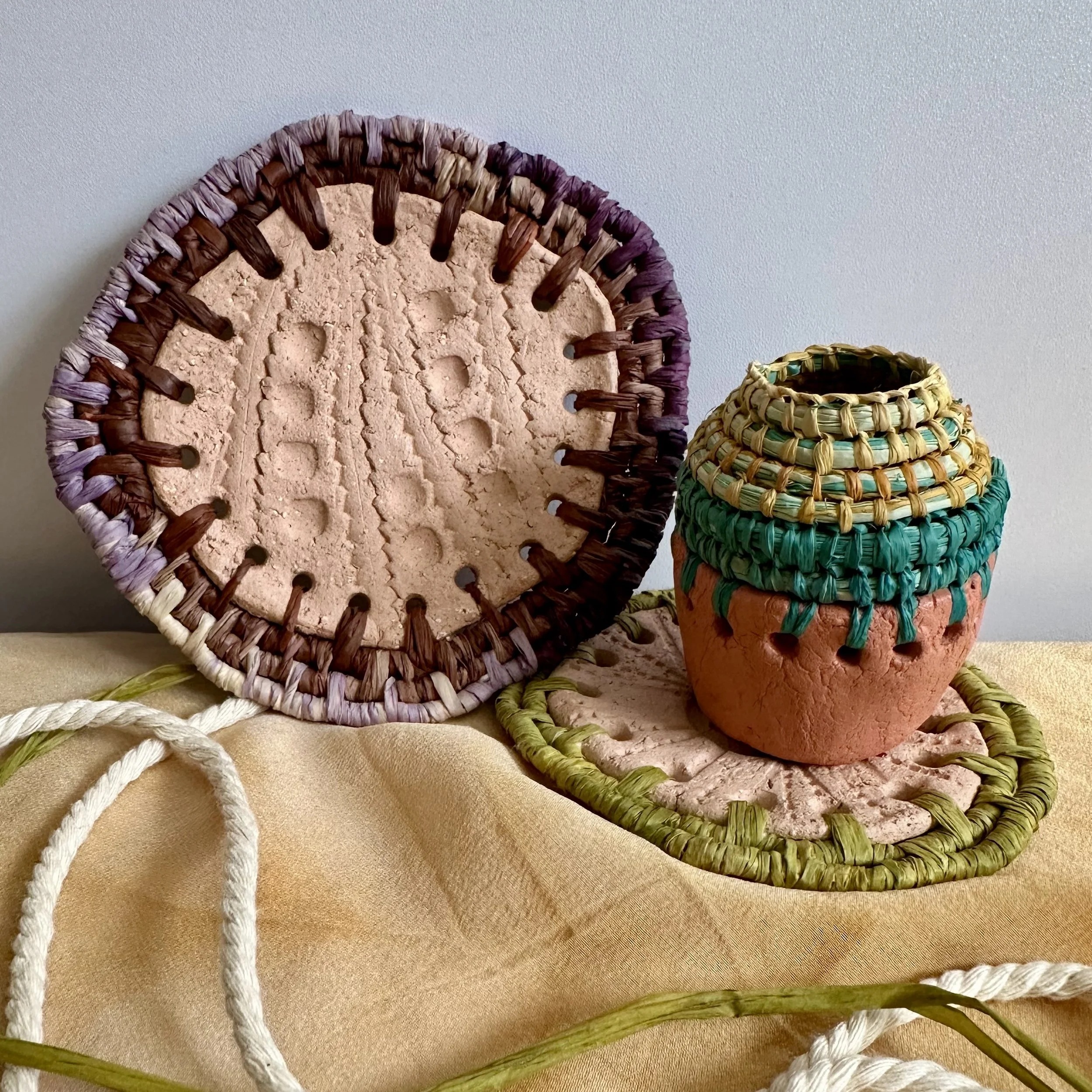 A two-part series combining clay forming and fibre weaving techniques to create intentionally imperfect vessels.